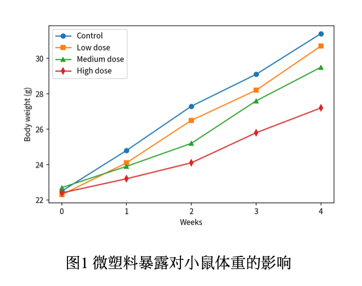 进一步比较各组小鼠在第4周时的体重,对照组为31.4g,低剂量组为30.7g,中剂量组为29.5g,高剂量组为27.2g。可以看出,随着微塑料暴露剂量的增加,小鼠体重逐渐降低,表明微塑料对小鼠体重的影响具有剂量依赖性。中、高剂量微塑料暴露对小鼠体重的抑制作用尤为明显。