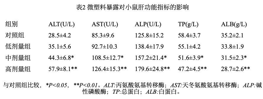 在低剂量组(10 mg/kg),ALT、AST和ALP水平略有升高,但与对照组相比差异无统计学意义(P>0.05)。然而,在中剂量组(50 mg/kg)和高剂量组(100 mg/kg),ALT、AST和ALP水平显著高于对照组(P<0.05或P<0.01),提示微塑料暴露对肝细胞造成了一定程度的损伤。ALT和AST是肝细胞受损时释放到血液中的酶类,是评估肝脏损伤的重要指标。ALP主要由肝脏合成,在肝胆疾病时血清ALP水平会升高。因此,微塑料暴露导致小鼠血清中ALT、AST和ALP水平升高,表明其对肝细胞具有毒性作用。